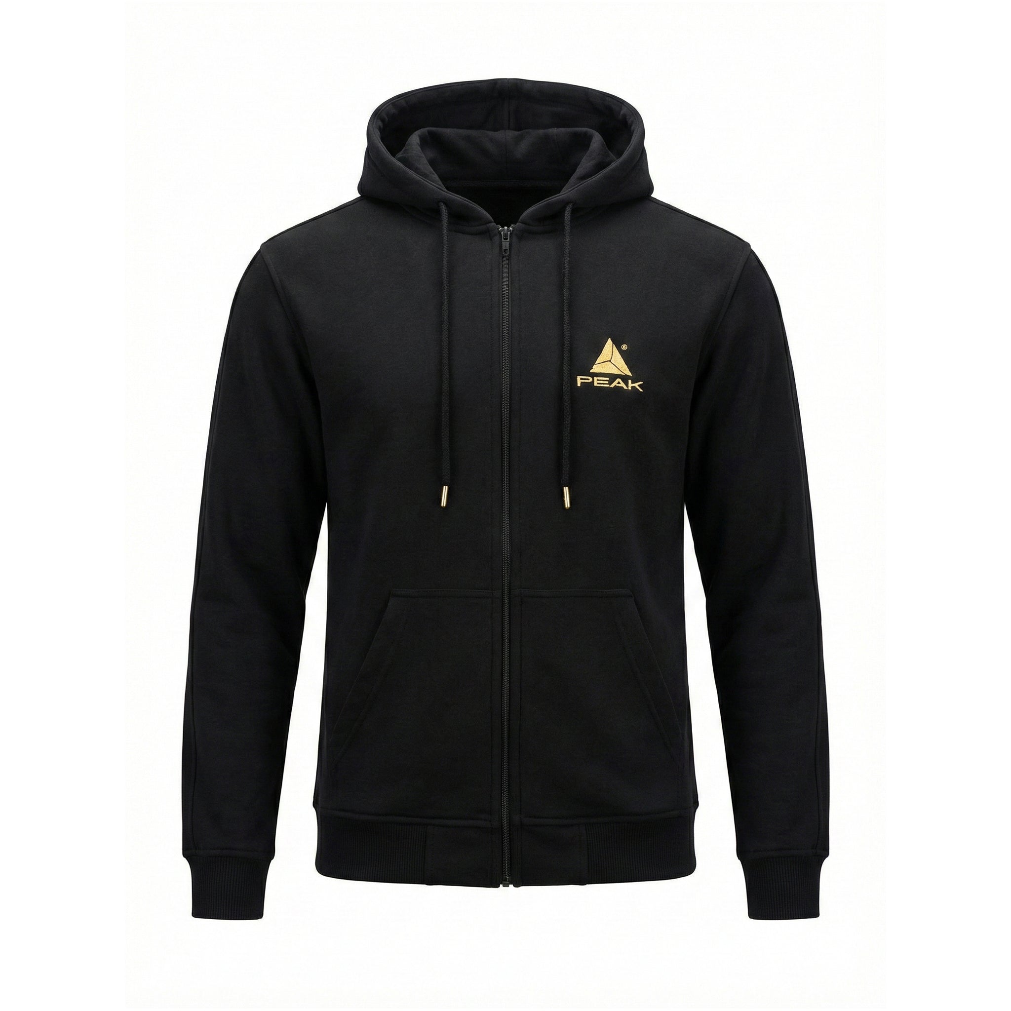 Der neue 2026 PEAK Hoodie aus 100% Baumwolle - mit praktischem Reißverschluss und Kapuze. Schwarz, mit Logo-Stickerei. Unisex Passform.